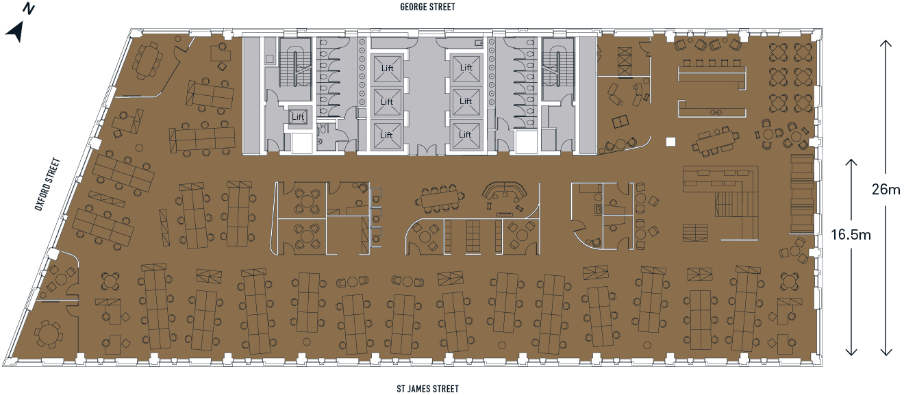 • Double-height reception with 90 ft (27m) frontage